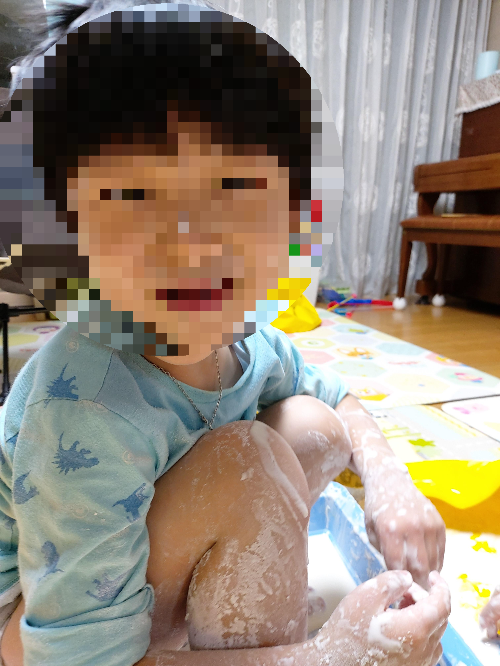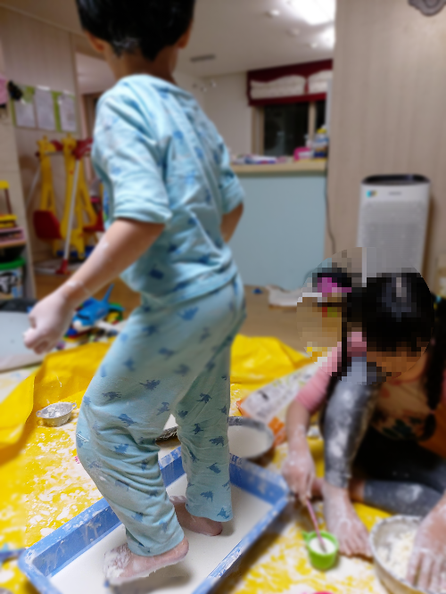 그래, 곱게 끝날리가 없지. 그랬으면 나도 아쉬웠을거같다. 아이는 아이답게 안전한 범위 안에서 하고싶은걸 실컷해야한다. 발로 밟고, 앉아도 보고. 온몸으로 느껴보라고 나중엔 옷도 벗겨주었다. 몸에 쓱쓱 바르고 다리로 저지레도 하는 2번 아기의 모습이 너무 보기좋다.