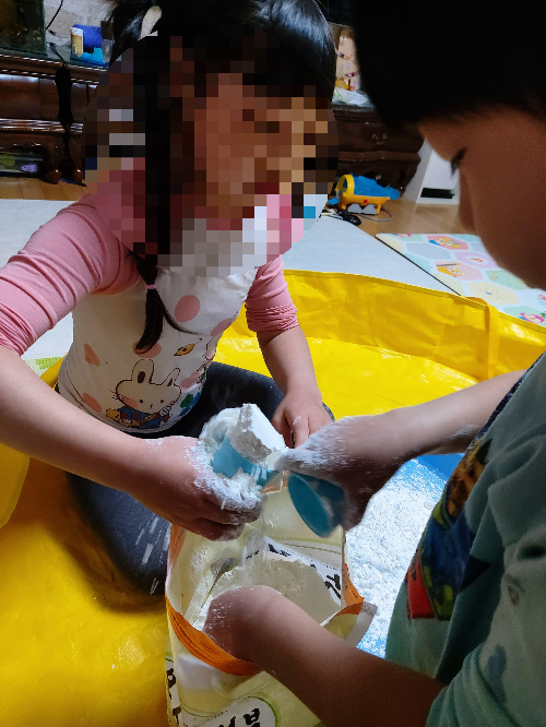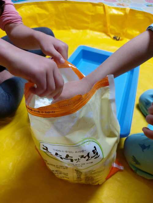 먹을 수 있는 음식 재료들은 아이들에게 너무 좋은 놀이가 된다. 특히 가루는 무척 매력적인데, 뒷정리를 생각해야한다. 밀가루는 물에 녹지 않아 씻을때 주의해야해서 전분가루로 선택했다. 매트를 까는 내내 마음이 두근두근하다. 부디, 이 매트 안에서 끝나길...
