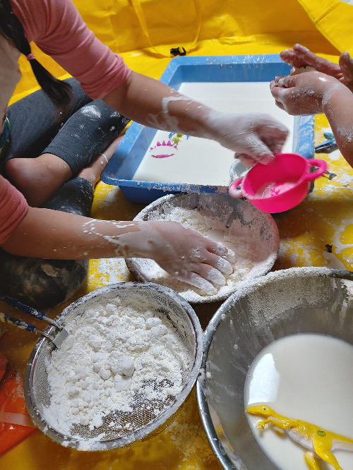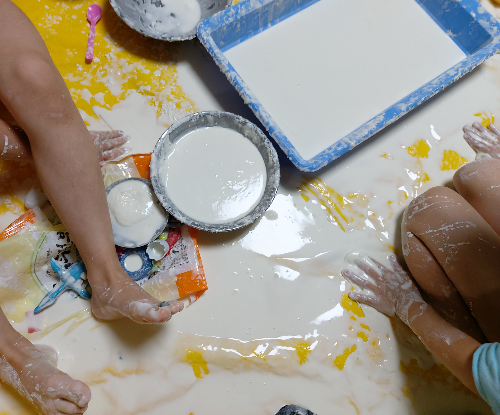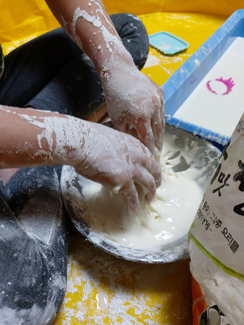 (준비물) 화내지않는 인내심. 매트. 전분. 물. 담을 수 있는 작은 통들.