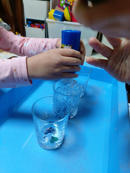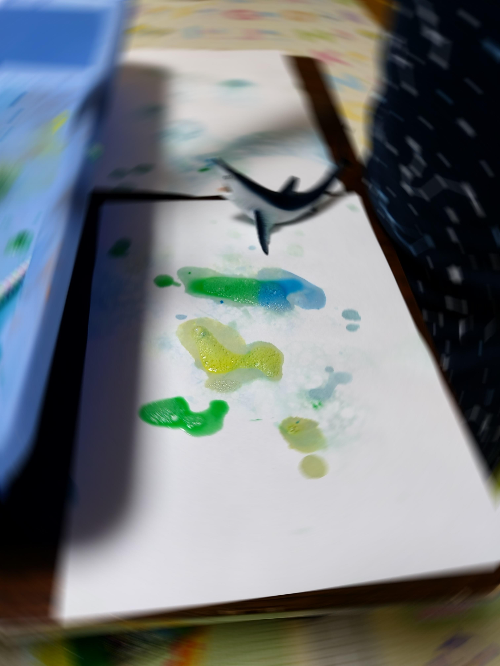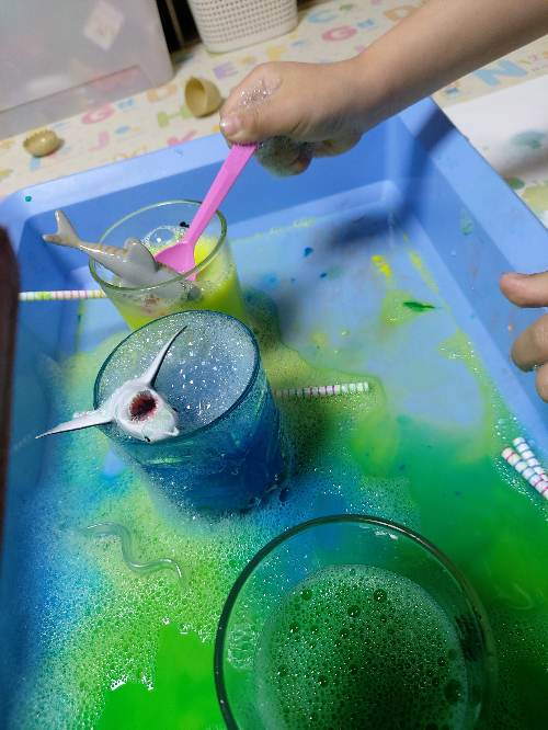 흐릿한 색상이 약간 불만인 아이들이 스스로 어떻게 해야하는지 생각하고는 물감을 더 짜넣고 숫가락으로(내 아이스크림 스푼...ㅠㅠ) 떠보기도 하고, 사랑사는 바다생물들 목욕도 시켜준다. 결론은 역시나 하고싶은 놀이로 끝나는구나. 이 새로운 아이디어들로 더 재밋는 놀이를 창작해내는 아이들. 너도 나도 즐거우니, 하길 잘했다!
