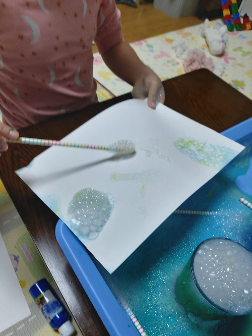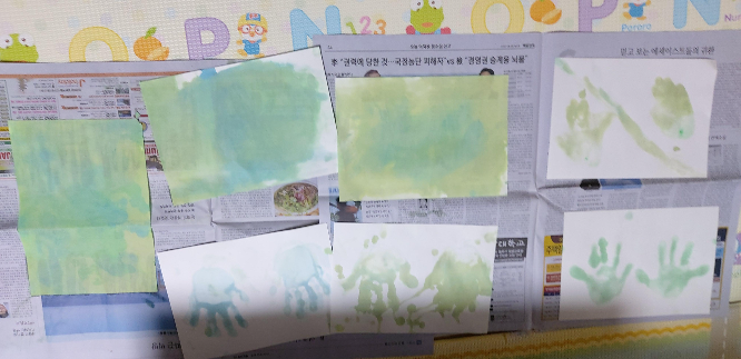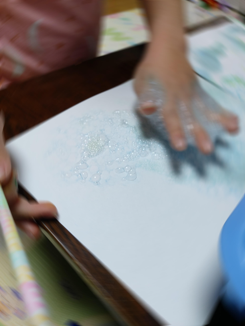 하고싶은걸 실컷 해봤으니 이제 그림을 그려볼 차례이다. 거품을 살짝 떠서 흰 종이에 올려본다. 그 모양이 무척 신기해서 사라질때까지 한참 쳐다보고 무늬도 내어본다. 종이를 바로 가지고 가서 거품을 떠보기도 한다. 손맛이 빠지면 서운하니 손으로도 토닥토닥 해주었다.