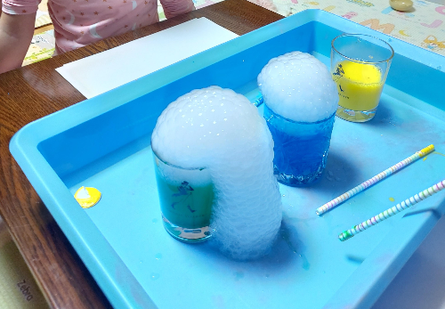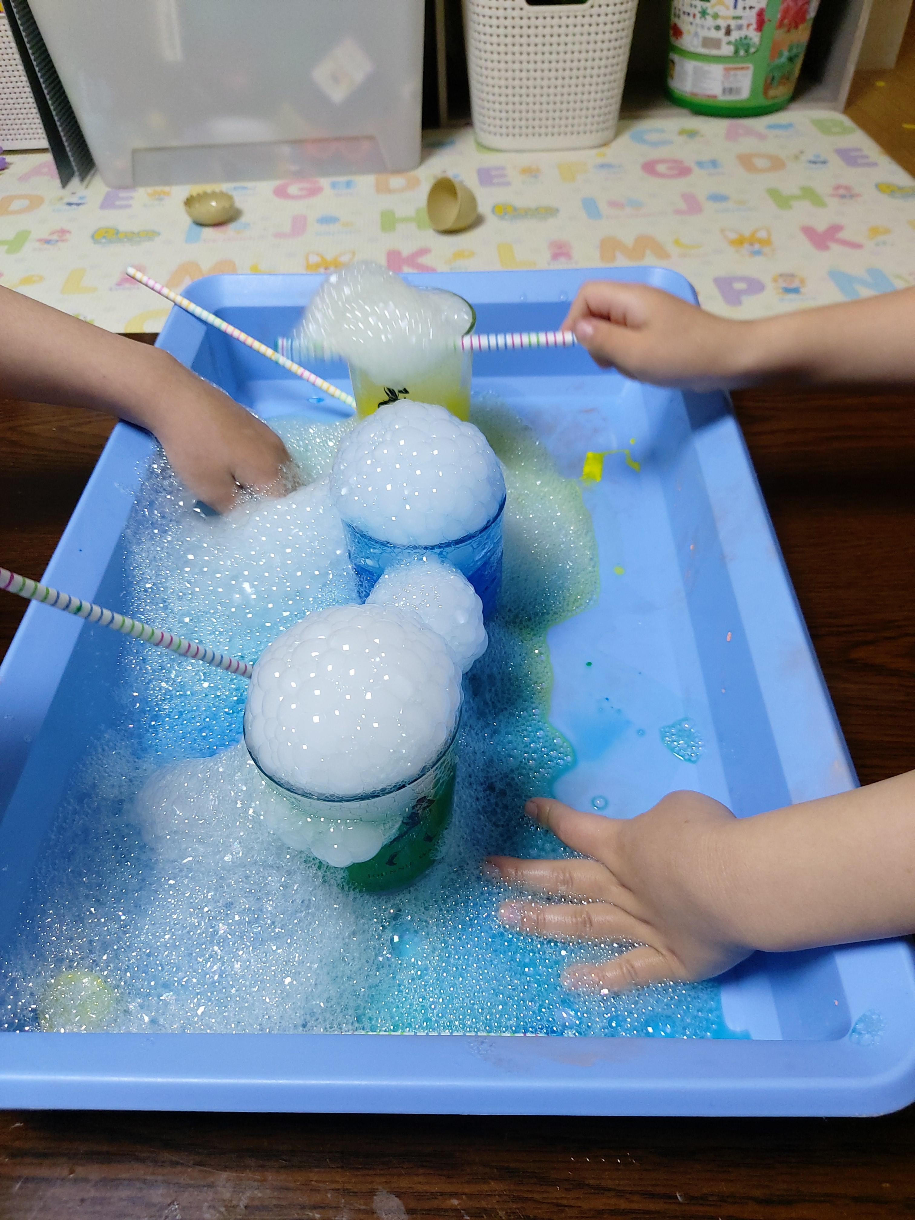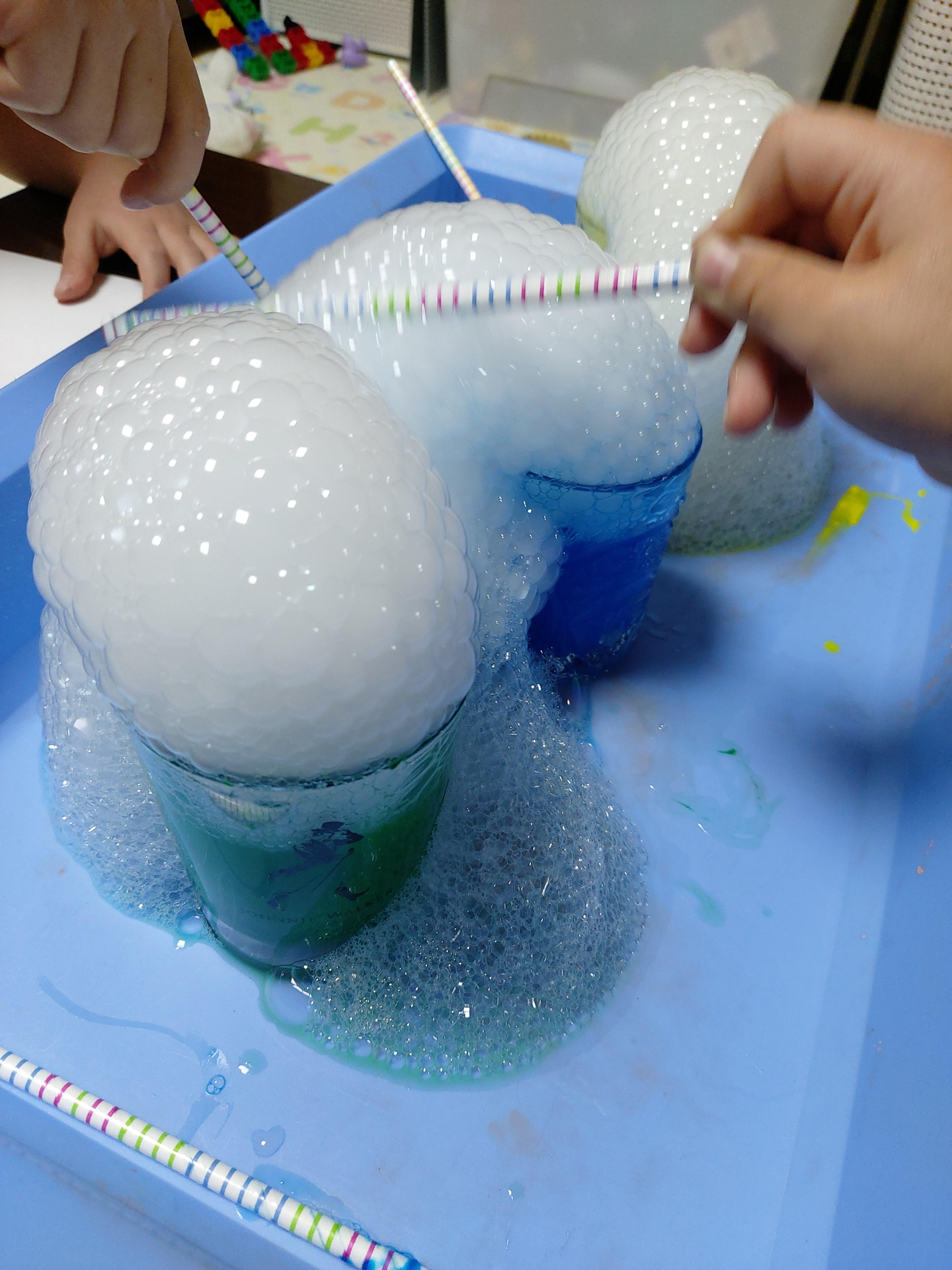 빨대로 거품을 콕콕 찔러보고 마구마구 망가뜨려도본다. 나중엔 손으로 거품을 조물조물. 컵 안에만 손을 넣지 않으면 무엇을 하던 하고싶은대로 다 해봐도 되니 아이들은 신이났다.