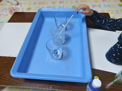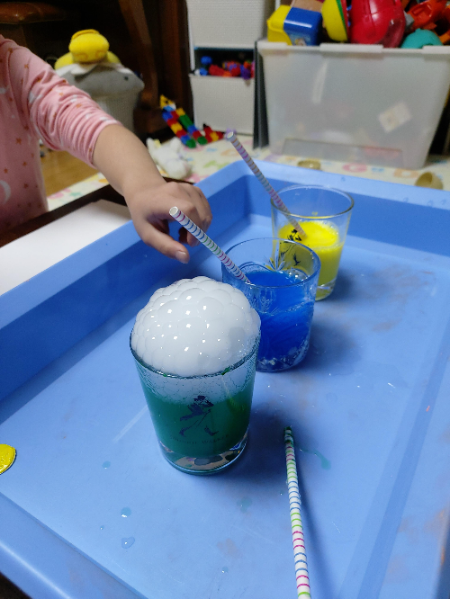 투명한 용기가 더 좋은 놀이인데, 마침 술을 마시던 중이라 술잔들을 몇개 꺼내왔다. 길다란 막대기가 필요하다. 나는 빨대를 활용했다. 물감을 쭈욱 짜넣고 물을 약간 부어 휘휘 저어 녹여주었다. 그리고 주방세제. 나는 처치곤란인 비눗방울용액이 많아서 그걸 마구마구 부어주었다.