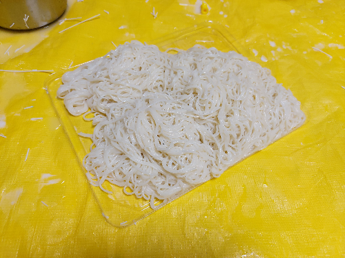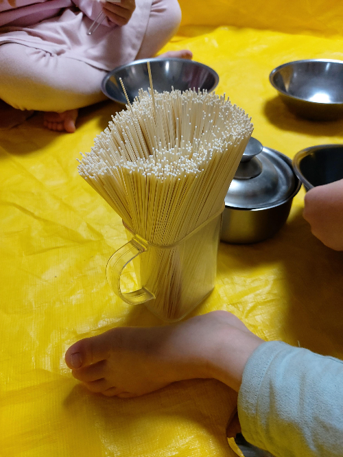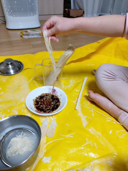 잔뜩 꽂아놓은 국수를 구경하는 아이들. 한가닥씩 뽑아 탐색한다. 조심조심 입으로 가져가 먹어보는게 먼저였다.