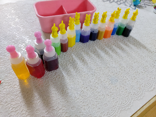 놀이를 시작하기 전에 아이들이 쉽게 쓸 수 있도록 큰 통의 물감들을 소분해두었다. (핑크뚜껑은 가루 식용색소. 손에 닿으면 물들어서 아이들이 만지는 놀이에는 사용하지않았다.)