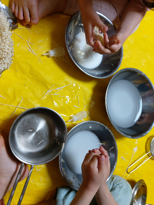 원래는 이걸 종이에 한가닥 두가닥씩 올려서 그림을 묻어나는 물감으로 그림을 그리는 놀이였는데(계획), 아이들이 이날 원했던건 계속 손으로 주무르고 노는거더라. 저번에 놀았던 전분 생각이 났는지, 전분도 필요하다고 이야기 한다. 놀이 하면서 적극적으로 요청하는건 정말 환영이다. 놀이 확장이 시작되는구나!