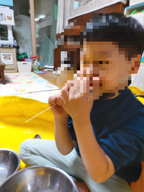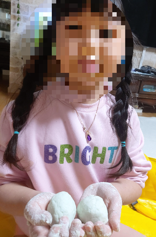 얼굴에는 간장범벅, 몸에는 전분범벅. 안에 국수가 들어간 동글동글한 색깔 전분떡을 만들어서 한가득 엄마, 아빠 먹으라고 준다. 고...고맙다?