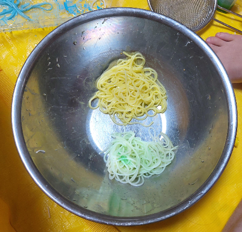 충분히 먹고 나서야 아이들 눈에 물감이 들어왔나보다. 마음에 드는 색을 꺼내 꾹 짜서 국수에 색을 입혀주었다. 나보다 더 손끝이 야무진거 보니, 나중에 요리할때 함께 해도 될 것 같다.