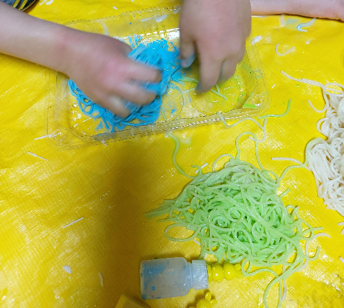 (준비물) 매트, 국수, 물감, 놀이도구들