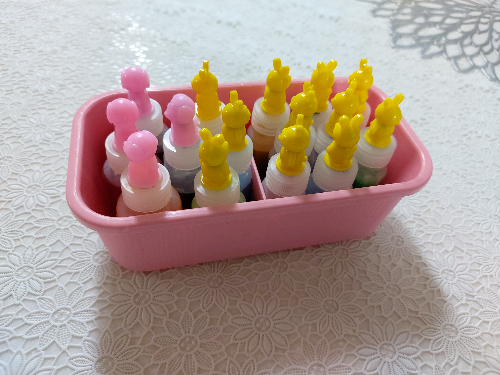 놀이를 시작하기 전에 아이들이 쉽게 쓸 수 있도록 큰 통의 물감들을 소분해두었다. (핑크뚜껑은 가루 식용색소. 손에 닿으면 물들어서 아이들이 만지는 놀이에는 사용하지않았다.)
