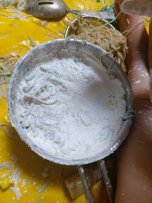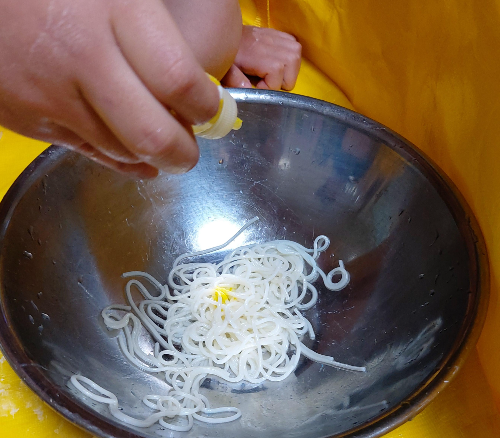 잔뜩 꽂아놓은 국수를 구경하는 아이들. 한가닥씩 뽑아 탐색한다. 조심조심 입으로 가져가 먹어보는게 먼저였다.