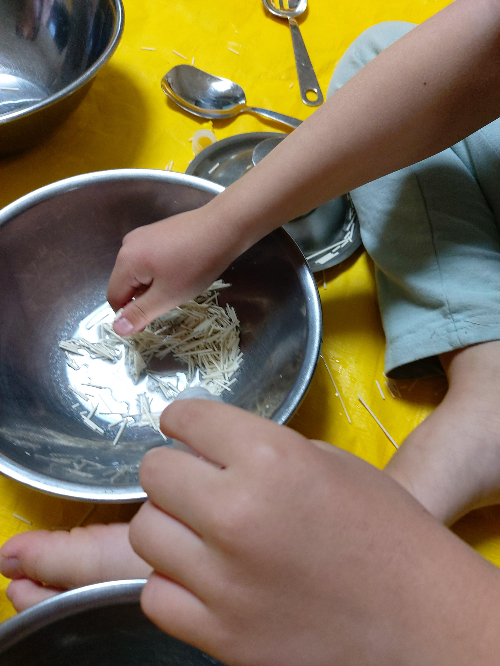 원래는 이걸 종이에 한가닥 두가닥씩 올려서 그림을 묻어나는 물감으로 그림을 그리는 놀이였는데(계획), 아이들이 이날 원했던건 계속 손으로 주무르고 노는거더라. 저번에 놀았던 전분 생각이 났는지, 전분도 필요하다고 이야기 한다. 놀이 하면서 적극적으로 요청하는건 정말 환영이다. 놀이 확장이 시작되는구나!