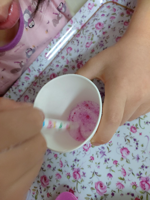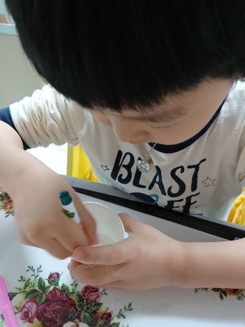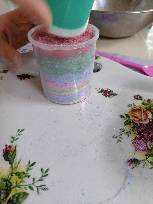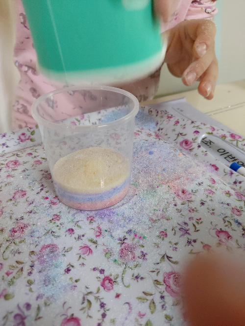 종이컵에 설탕을 적당히 떠 넣는다. 그리고 원하는 색 싸인펜으로 휘휘 저어준다. 종이컵 바닥에 그림그린다는 생각으로 쓱쓱쓱 계속 그리다보면 설탕에 색이 입혀진다. 물론, 이날 쓴 싸인펜은 적당히 미술할때 몇번 쓰고 다 버렸다. 충분히 많이 오래 쓴 싸인펜으로 해야한다. 고개 한번을 안들고 집중해서 한다.