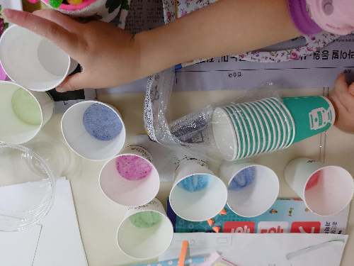 (준비물) 설탕, 싸인펜, 종이컵, 종이, 물풀, 스푼, 투명한 통(점토통?) 여기저기 흩날리는 설탕을 참을 수 있는 인내심