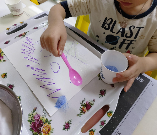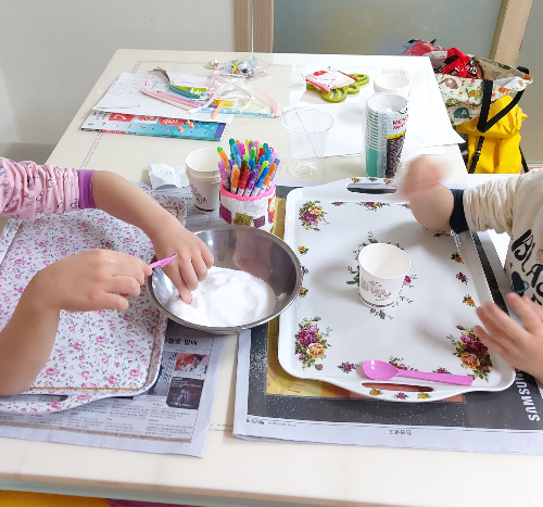 눈처럼 새하얀 가루. 설탕. 시작전부터 이미 손으로 계속 집어먹고 난리가 났다. 수저로 그나마 안떠먹어서 다행이지.(침 들어간다고 질색하면서 깔끔쟁이 둘째가 질색을 하더라) 탐색 과정이니 충분히 먹으라고 냅뒀더니, 정말 끝도 없이 먹었다.