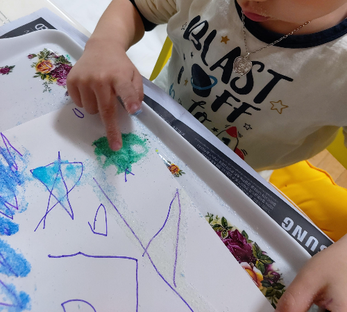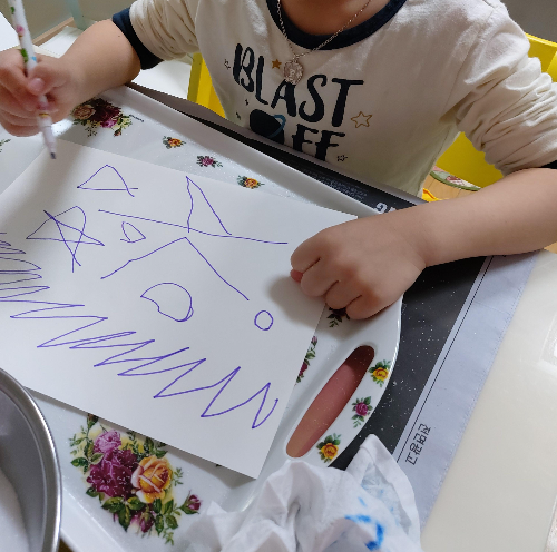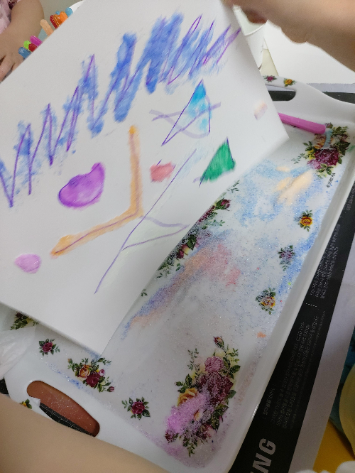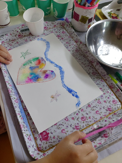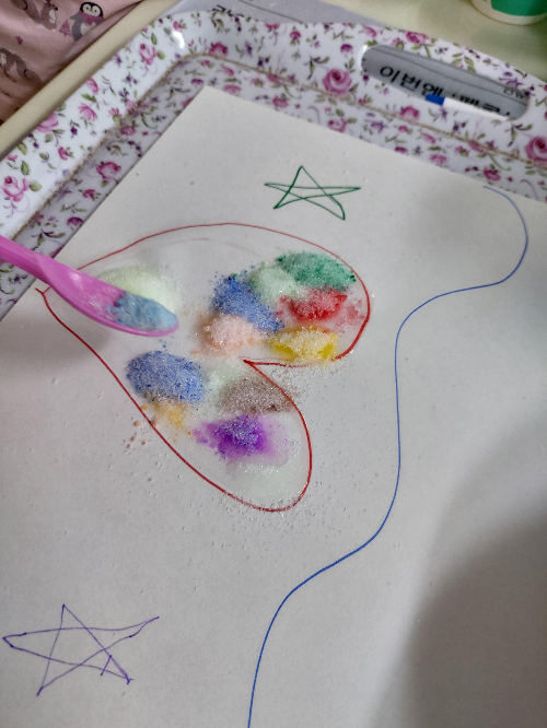 여러가지로 색설탕을 만들어주었으면 종이 한장에 자유롭게 그림을 그린다. 그린 그림을 따라 물풀을 칠해주고는 그 위에 원하는 색의 설탕을 솔솔 뿌려준다. 각각 하나씩 해도 좋고 한번에 해놓고 부분부분 뿌려도 좋더라.