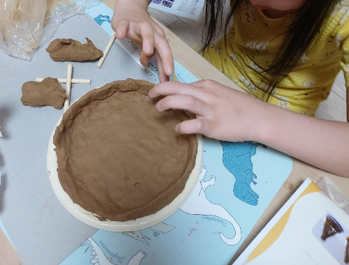 점토를 주물주물 만들어 접시에 잘 펴주었다. 접시 가득 펴주고나서 빙 둘러 1센치정도 담을 세운다. 너무 집중했는지 숨쉬는 소리조차 안들리고 고요하다.