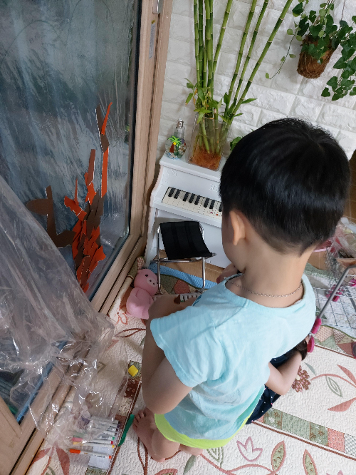 쉽고 간단하며, 아이들 작품까지 한곳에 모아둘 수 있었다. 유리창에 그림그리는 크레용을 들고와서 파도도 그리고, 물풀, 바위들도 그리기 시작한다. 놀이는 지금부터 시작인가보다.