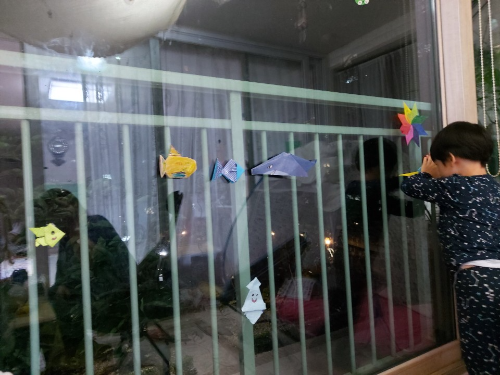 끝도없이 양산되는 작품들에게 자리를 정해주었다. 접으면 접는 대로 재접착 양면테이프를 붙여서 유리창에 붙이면 끝. 전체 면 몽땅 다 바다속이라고. 유리창은 밤에는 심해가 되고, 낮에는 파란바다가 되어준다. 물고기들이 계속 늘어나면서 증식하고 있다.