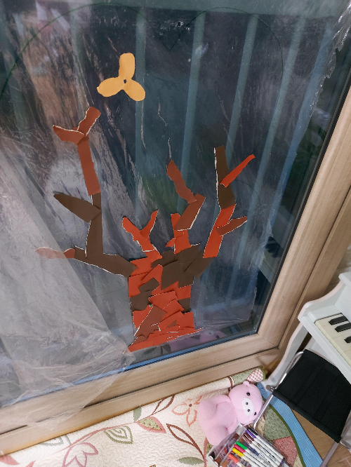 투명한 비닐로 아이들 키높이 만큼 유리창에 붙여준다. 그 사이 아이들은 갈색 계열 색종이를 손으로 쫙쫙 찢어준다.